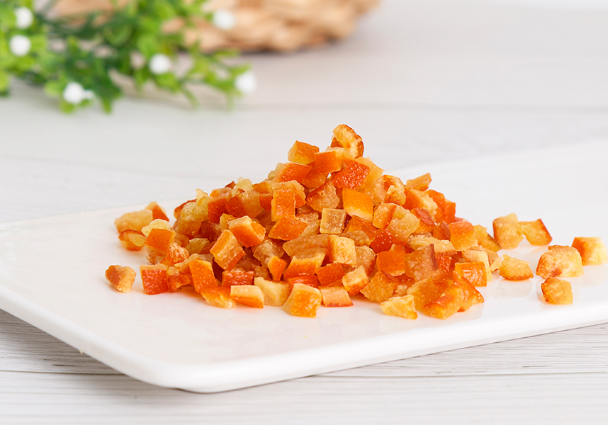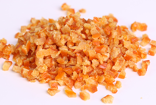 橙皮脯是將冷凍橙皮進(jìn)行糖漬、干燥、切丁,用于巧克力、面包、蛋糕、華夫餅等的餡料,橙皮脯以其特有的風(fēng)味廣受烘焙用戶(hù)的歡迎。
